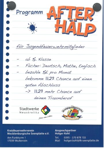 Der Kreisfeuerwehrverband Mecklenburgische Seenplatte arbeitet seit Jahren am Projekt „Zukunft“, mit mehreren Teilprojekten, um dem Mitgliederschwund in den Freiwilligen Feuerwehren entgegen zu wirken, das Ehrenamt Feuerwehr zu stärken und damit gleichzeitig ein Zugewinn für das gesellschaftliche Leben in unserer Region zu schaffen. Das Nachhilfeprojekt ist ein Projekt, bei dem Jugendfeuerwehrmitgliedern ab der 5. Klasse Hilfe in der schulischen Bildung angeboten wird. Durch Verbesserung der Schulnoten kann bei den Jugendlichen eine Stärkung des Selbstvertrauens und des Selbstwertgefühls erreicht werden. Ziel ist es die Mädchen und Jungen mit einem guten Schulabschluss in der Region zu halten, in dem sie eine Lehrstelle hier finden und später einen Arbeitsplatz. Der Kreisfeuerwehrverband organisiert das Projekt mit den Feuerwehren und dem Einverständnis der Eltern. Unterstützt wurden wir bisher von Lehrern aus der entsprechenden Region. Der Kreisfeuerwehrverband sucht zur Weiterführung und Unterstützung des Nachhilfeprojektes Lehrer oder Studenten, besonders in den Bereichen Penzlin, Dargun, Demmin und Stavenhagen. Für den Kreisfeuerwehrverband koordiniert Kamerad Holger Kohl in der Geschäftsstelle des KFV MSE das Nachhilfeprojekt. Er ist unter 0395 57087 8155 zu erreichen und per Mail unter Holger.Kohl@lk-seenplatte .de. Ist das Interesse geweckt? Über Nachfragen und Angebote zur Hilfe würden wir uns sehr freuen.