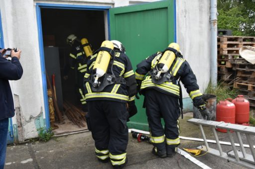Neben einem theoretischen Teil gehört auch ein praktischer Ausbildungs- und Übungsteil als praktische Prüfung dazu. In dem praktischen Teil der Ausbildung ging es darum, einmal einen Brand in einer Lagerhalle und zum anderen ein brennendes Fahrzeug zu bearbeiten. Sowohl in der Halle als auch im Fahrzeug lagerten gefüllte Gasflaschen, die zu explodieren drohten.