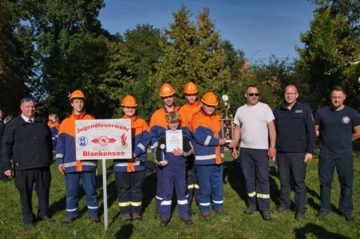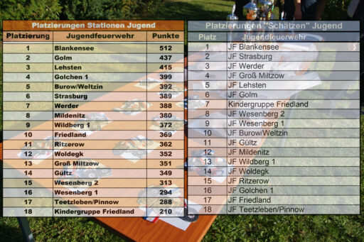Bei den Jugendfeuerwehren siegte mit 512 Punkten die Mannschaft aus Blankensee und sicherte sich somit den Sieger- und den neuen Wanderpokal. 75 Punkte dahinter kam auf den zweiten Platz die Jugendfeuerwehr Golm und weitere 22 Punkte weniger, die Jugendfeuerwehr Lehsten auf den dritten Platz.