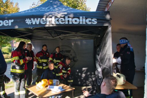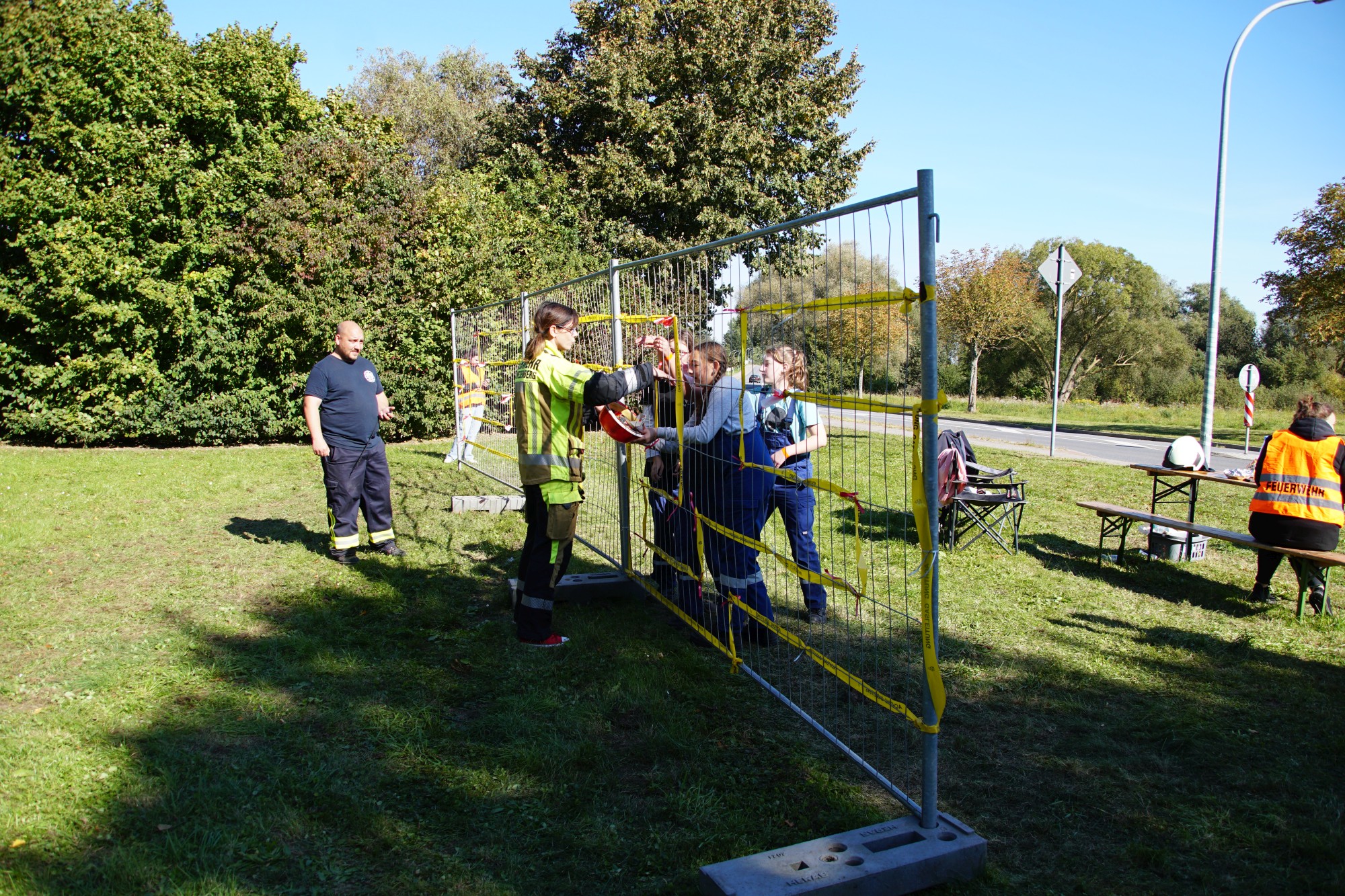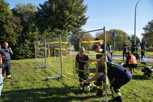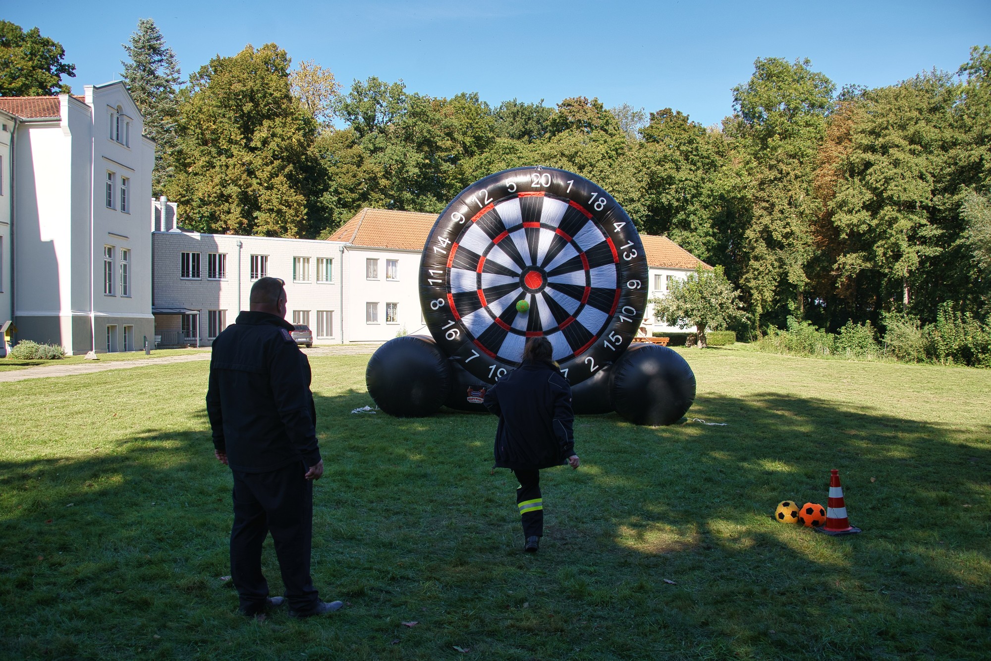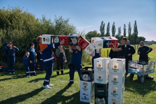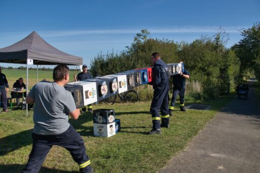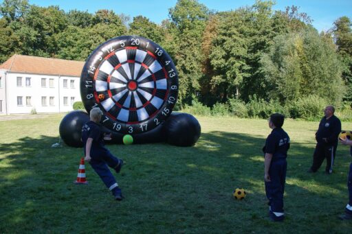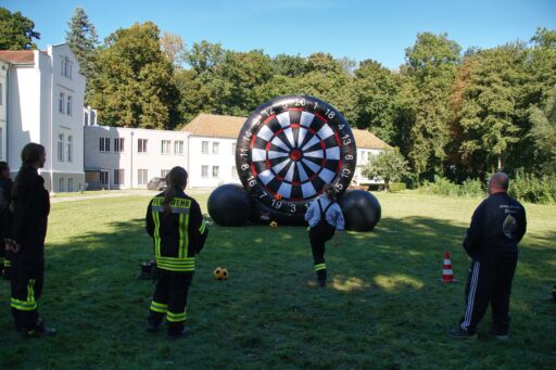 An einem überdimensional großen Dartspiel galt die Treffsicherheit mit einem Fußball, der per Klett auf dem Feld kleben bleiben musste, gezählt wurde wie beim richtigen Dart. Umfunktioniert wurde ebenfalls das Spiel „Heißer Draht“. Mit Schnelligkeit und Teamfähigkeit galt es, durch das Gitter von Bauzäunen, auf einer Strecke einen Feuerwehrhelm zu befördern. Wer beim Kistenstapeln hoch hinaus wollte, lag komplett falsch! Zwischen zwei Teammitgliedern mussten die Kisten längs “gestapelt“ werden, nur zwei weitere durften helfen und das verwendete “Leergut“ bis zum Ende der vorgegebenen Zeit von zwei Minuten halten. Pro Kiste gab es fünf Punkte.