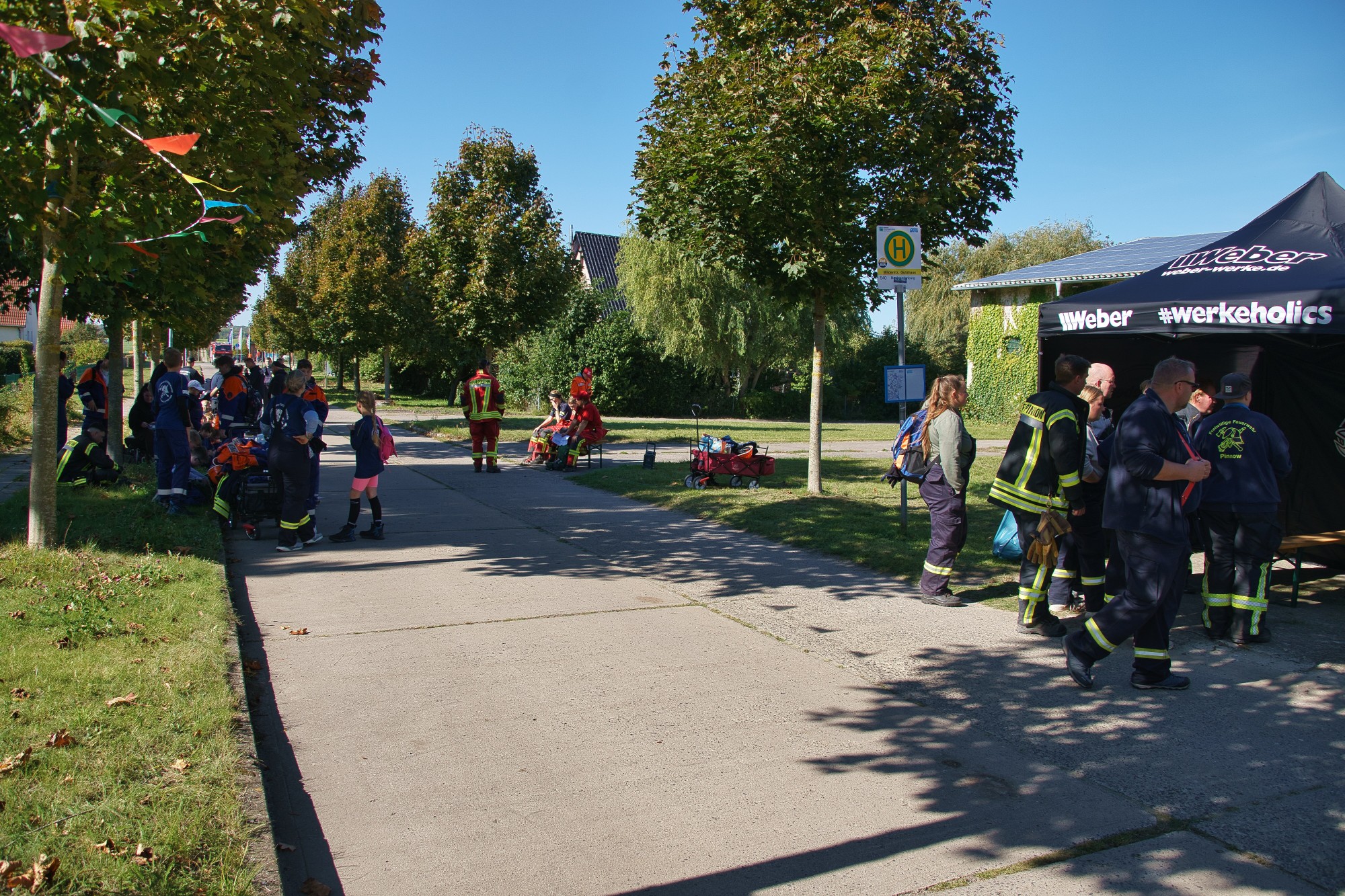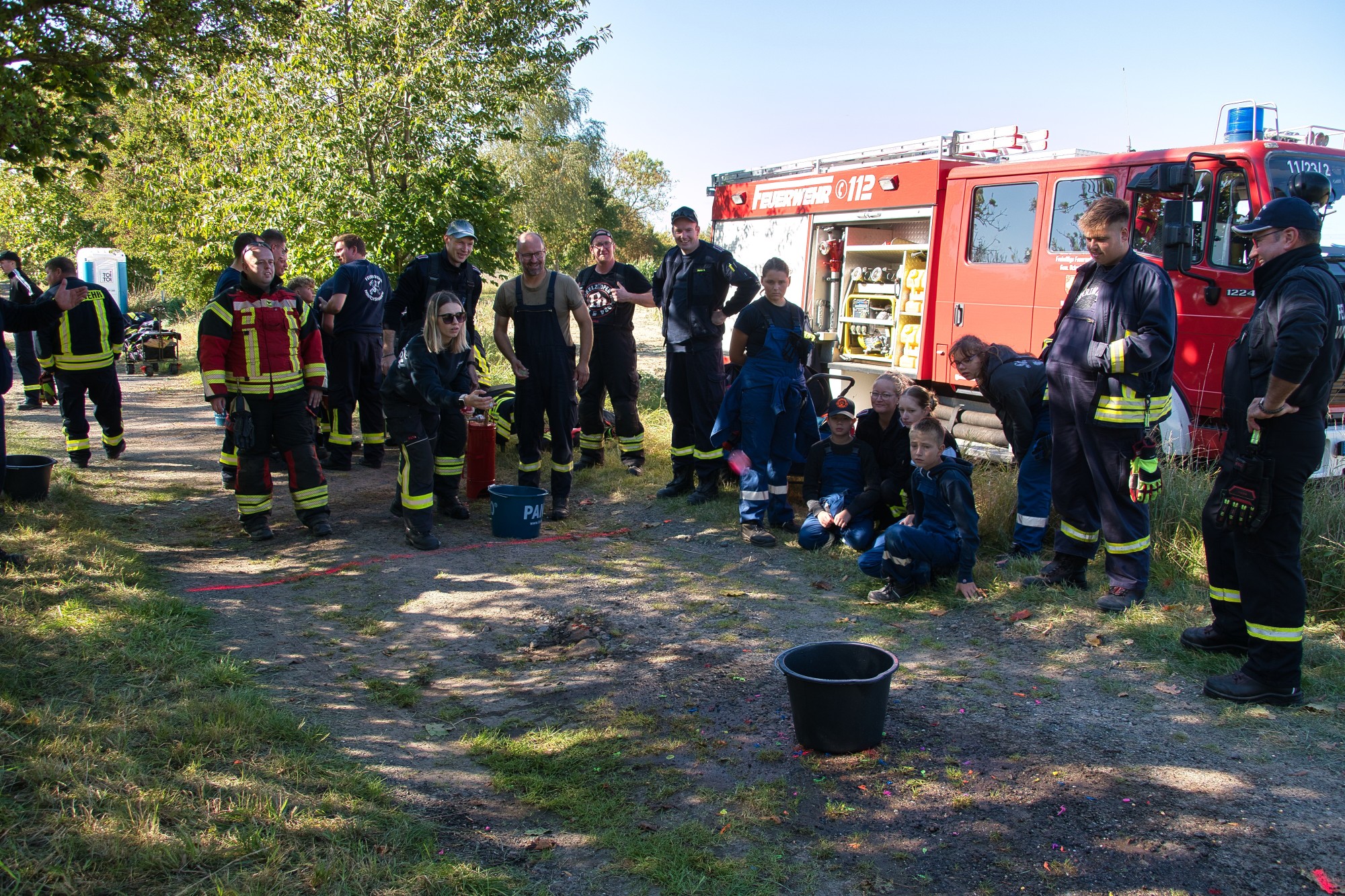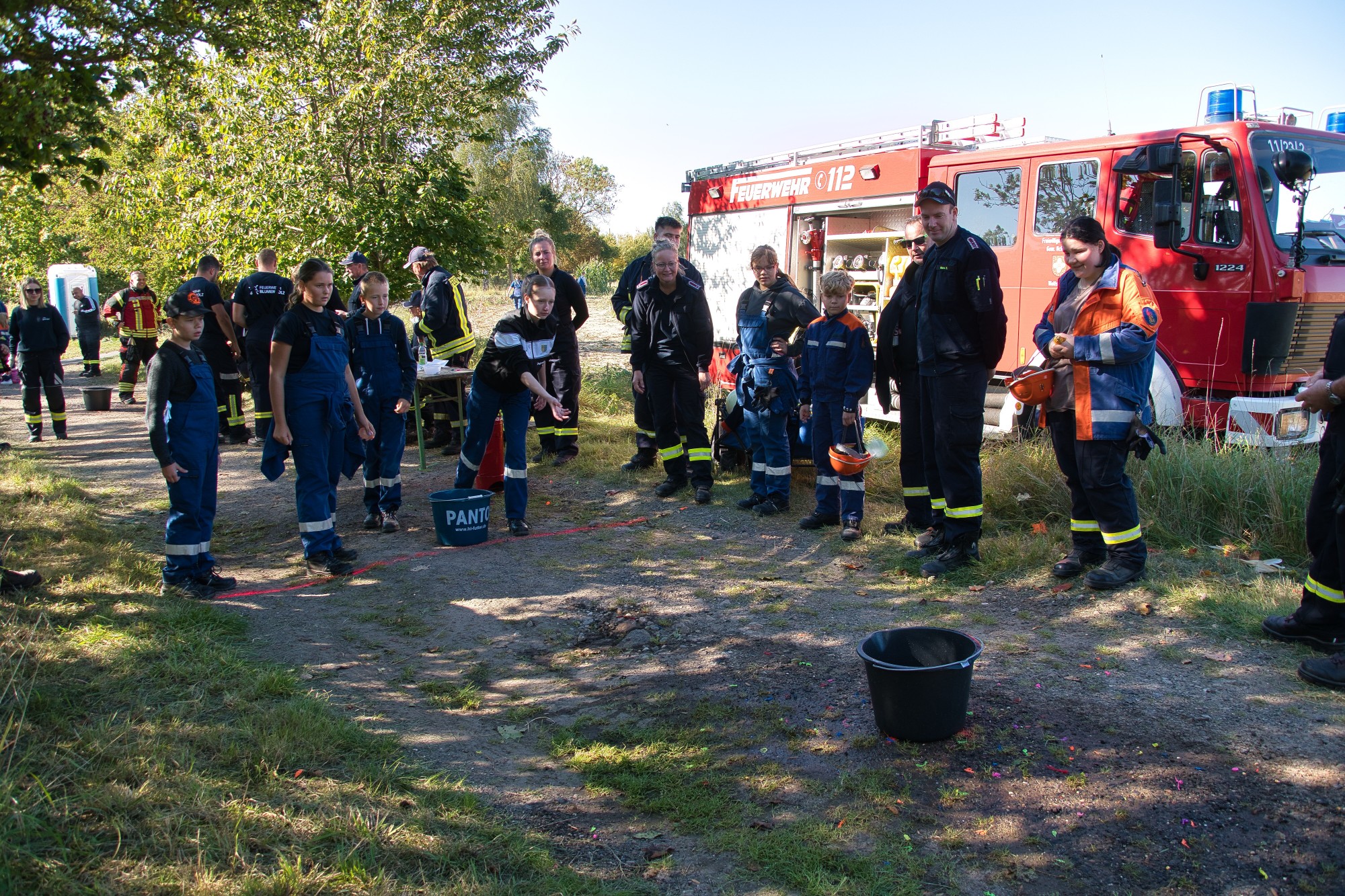 An einem überdimensional großen Dartspiel galt die Treffsicherheit mit einem Fußball, der per Klett auf dem Feld kleben bleiben musste, gezählt wurde wie beim richtigen Dart. Umfunktioniert wurde ebenfalls das Spiel „Heißer Draht“. Mit Schnelligkeit und Teamfähigkeit galt es, durch das Gitter von Bauzäunen, auf einer Strecke einen Feuerwehrhelm zu befördern. Wer beim Kistenstapeln hoch hinaus wollte, lag komplett falsch! Zwischen zwei Teammitgliedern mussten die Kisten längs “gestapelt“ werden, nur zwei weitere durften helfen und das verwendete “Leergut“ bis zum Ende der vorgegebenen Zeit von zwei Minuten halten. Pro Kiste gab es fünf Punkte.