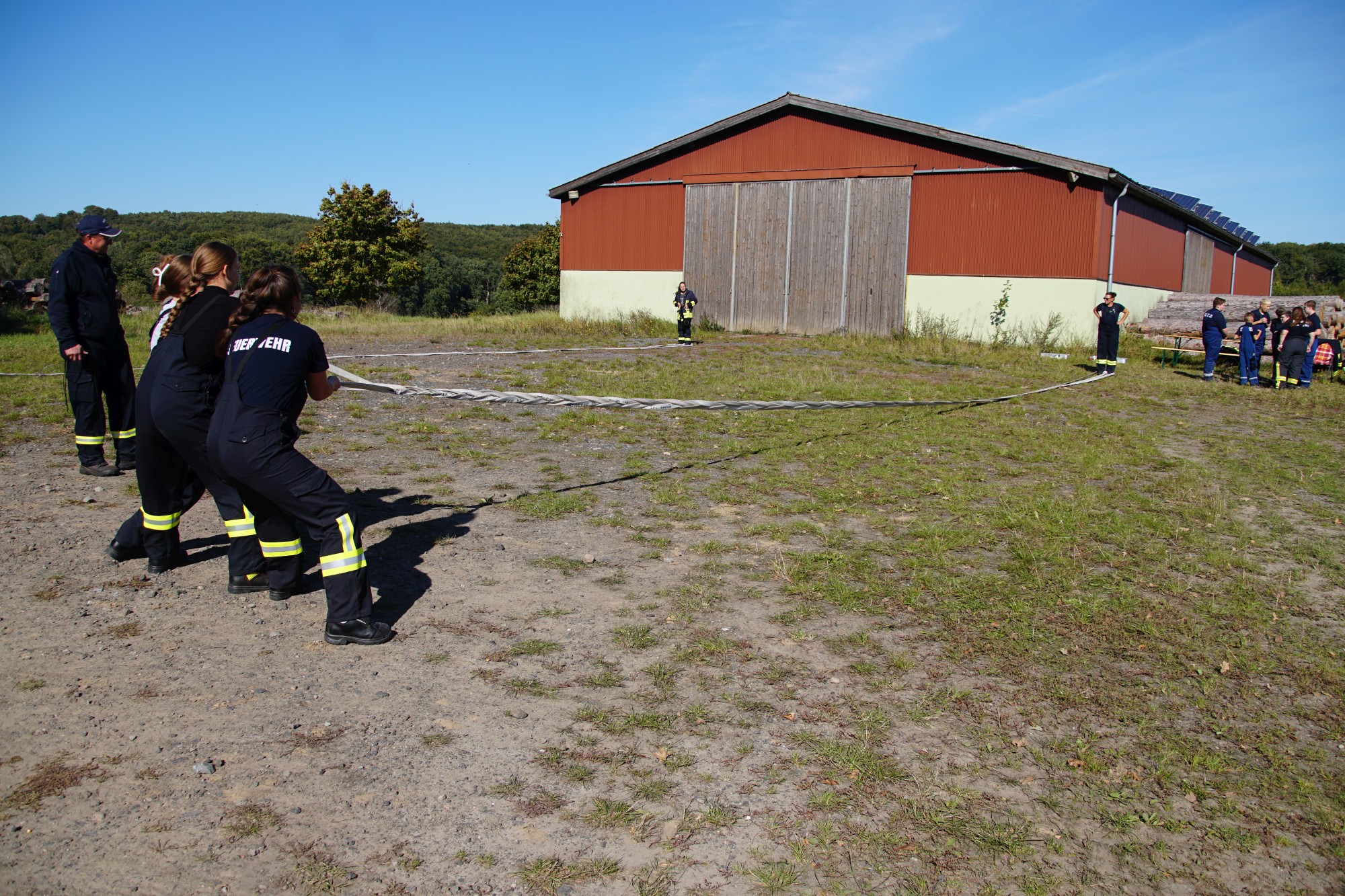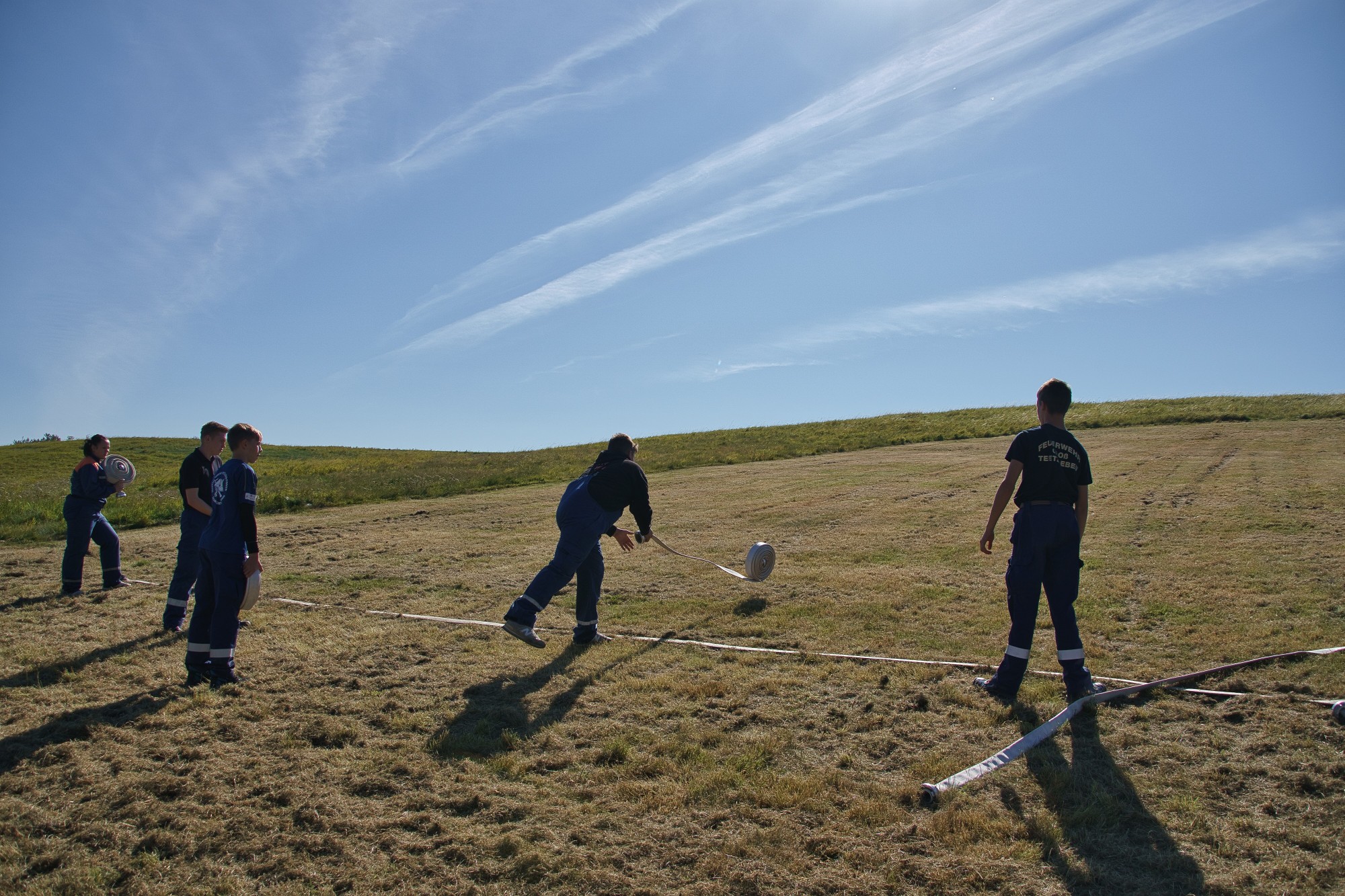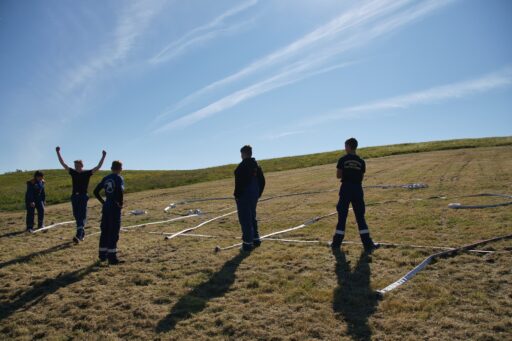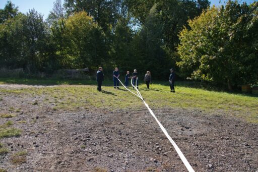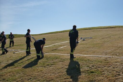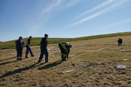 Unweit vom höchsten Punkt des Helpter Berges befand sich die Aufgabe „Schläuche flechten“! Aus drei Feuerwehrschläuchen sollte ein Zopf geflochten werden, wo natürlich ebenfalls die Zeit eine Rolle spielte und es zählten am Ende die kompletten Knoten.