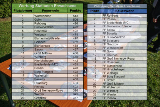 Bereits nach der Anmeldung der jeweiligen Mannschaften galt es schon die erste Aufgabe zu lösen! In der berüchtigten Schätzaufgabe war das Gewicht eines kleinen, mit Linsen gefüllten Säckchens, zu erraten. Das Ergebnis, welches meistens immer etwas mit der Feuerwehr oder dem Austragungsort zu tun hat, war 179 Gramm und bezog sich auf die Höhe des Helpter Berges. Mit einer Differenz von nur wenigen Gramm holte sich bei der Siegerehrung die Feuerwehr Rehberg den Pokal, knapp gefolgt von den Feuerwehrmannschaften aus Pensin und Bredenfelde. Der Wanderpokal bei den Jugendfeuerwehren geht nach Blankensee, über die Plätze zwei und drei freuten sich die Mannschaften aus den Jugendfeuerwehren Strasburg und Werder.